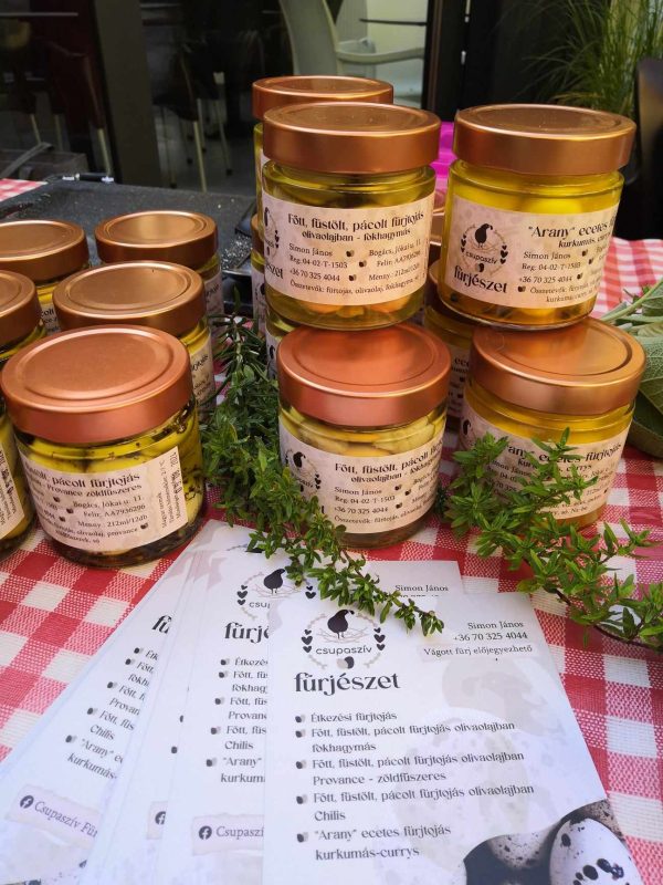 Többféle ízben készítünk pácolt fürjtojásokat, amelyekből a füstölt-zöldfűszeres és az “arany”(curry-kurkumás) a legkedveltebb vásárlóink ​​körében a chilis valamint a konfitált fokhagymás mellett.